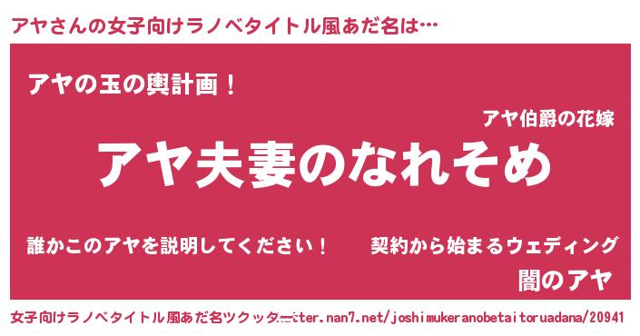 | 男性向けラノベタイトル風あだ名 | 『おまえをオタクにしてやるから、俺をアヤにしてくれ! 』 |