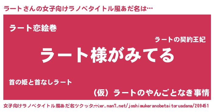 | 男性向けラノベタイトル風あだ名 | 『ラートの嫁は女の子じゃないと思った?』 |
