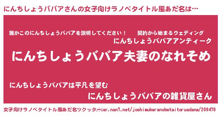 | 男性向けラノベタイトル風あだ名 | 『おまえをオタクにしてやるから、俺をにんちしょうババアにしてくれ! 』 |