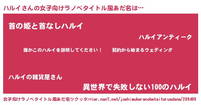 | 男性向けラノベタイトル風あだ名 | 『ハルイアートオンライン』 |
