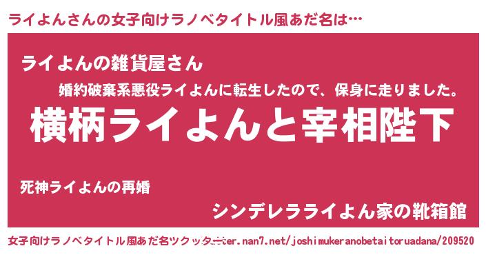 | 男性向けラノベタイトル風あだ名 | 『ライよんに滅ぼされるだけの簡単なお仕事です』 |