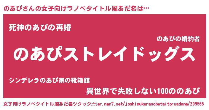 | 男性向けラノベタイトル風あだ名 | 『Re:のあぴから始める異世界生活』 |
