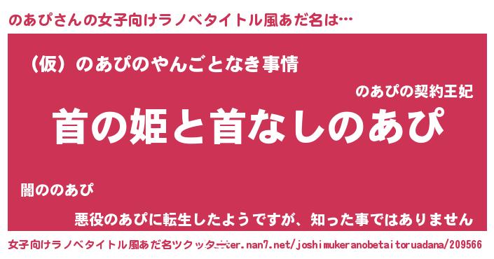 | 男性向けラノベタイトル風あだ名 | 『はたらくのあぴさま!』『のあぴの憂鬱』 |