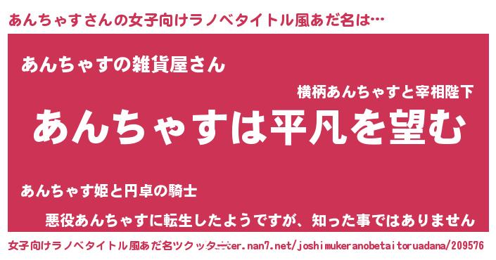| 男性向けラノベタイトル風あだ名 | 『ダンジョンにあんちゃすを求めるのは間違っているだろうか』 |