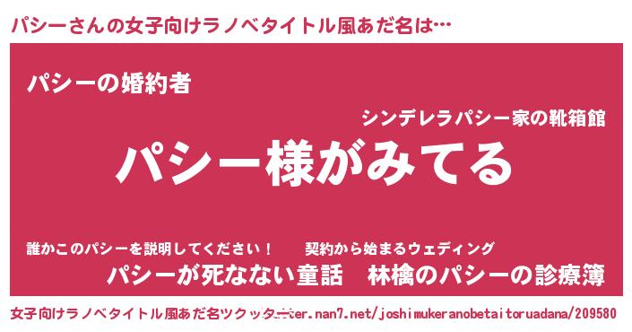 パシーさんの女子向けラノベタイトル風あだ名は… 『パシー様がみてる』『パシーの婚約者』『パシーが死なない童話 林檎のパシーの診療簿』 ツクッター #女子向けラノベタイトル風あだ名ツクッター http://tkutter.nan7.net/joshimukeranobetaitoruadana/209580/