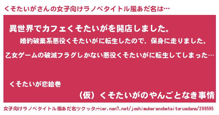 | 胡散臭い通販商品みたいなあだ名 | 『世界中を虜にした100年もののヴィンテージワイン…その名も「くそたいが」』 |
