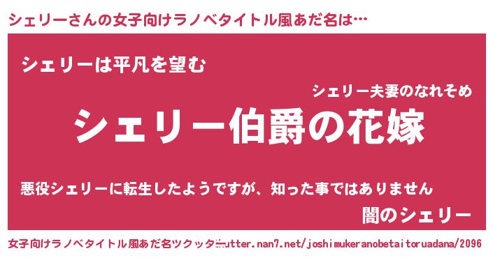 男性向けラノベタイトル風あだ名 | 『うちの娘の為ならば、俺はもしかしたらシェリーも倒せるかもしれない。』 |
