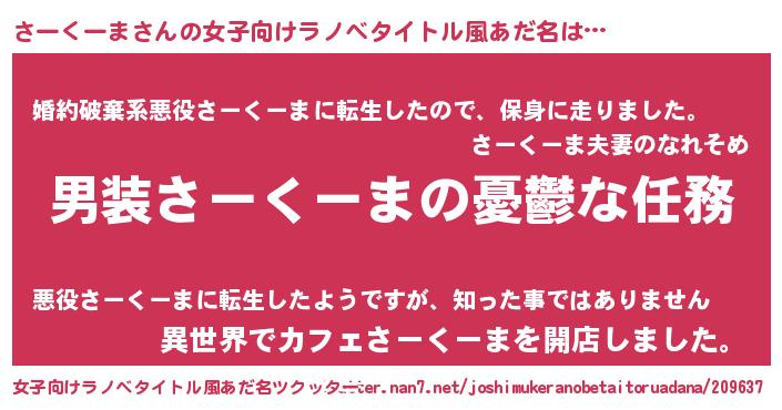 | 男性向けラノベタイトル風あだ名 | 『冴えないさーくーまの育てかた』 |