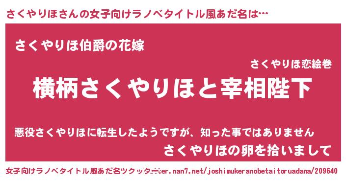 さくやりほさんの女子向けラノベタイトル風あだ名は… 『横柄さくやりほと宰相陛下』『さくやりほ伯爵の花嫁』『さくやりほの卵を拾いまして』 ツクッター #女子向けラノベタイトル風あだ名ツクッター http://tkutter.nan7.net/joshimukeranobetaitoruadana/209640/