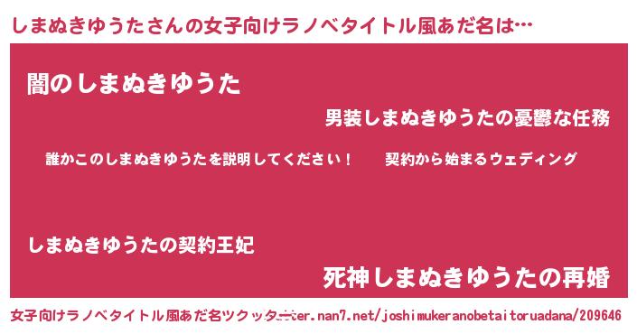 | 男性向けラノベタイトル風あだ名 | 『シマヌキユウタアートオンライン』 |