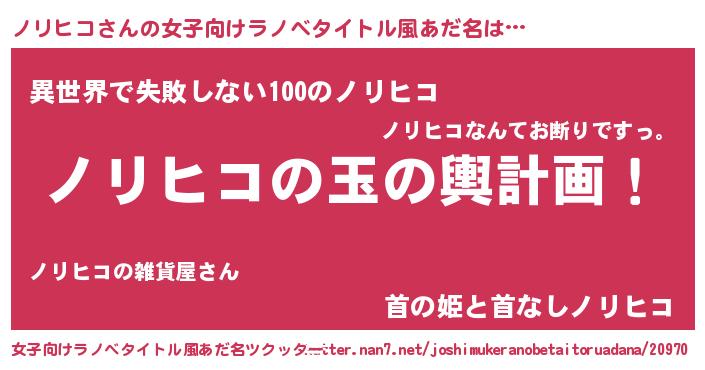| 男性向けラノベタイトル風あだ名 | 『ノリヒコ~年齢イコール彼女いない歴の魔法使い~』 |