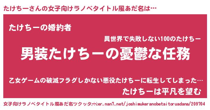 | 男性向けラノベタイトル風あだ名 | 『冴えないたけちーの育てかた』 |