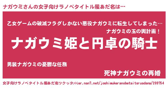 ナガウミさんの女子向けラノベタイトル風あだ名は… 『ナガウミ姫と円卓の騎士』『乙女ゲームの破滅フラグしかない悪役ナガウミに転生してしまった…』『死神ナガウミの再婚』 ツクッター #女子向けラノベタイトル風あだ名ツクッター http://tkutter.nan7.net/joshimukeranobetaitoruadana/209754/