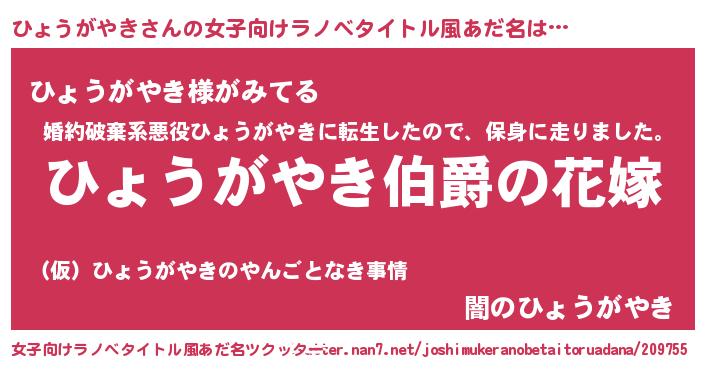 | 男性向けラノベタイトル風あだ名 | 『やはりひょうがやきの青春ラブコメはまちがっている 』 |