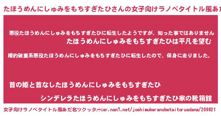 | 胡散臭い通販商品みたいなあだ名 | 『ハリウッド女優が絶賛した世界で10本だけ現存している希少なブランデー…その名も「たほうめんにしゅみをもちすぎたひ」』 |