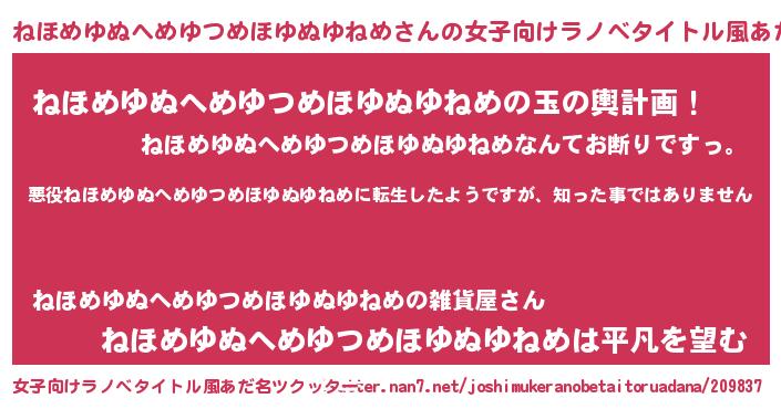 | 男性向けラノベタイトル風あだ名 | 『この素晴らしい世界にねほめゆぬへめゆつめほゆぬゆねめを!』 |