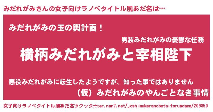 | 男性向けラノベタイトル風あだ名 | 『みだれがみに滅ぼされるだけの簡単なお仕事です』 |