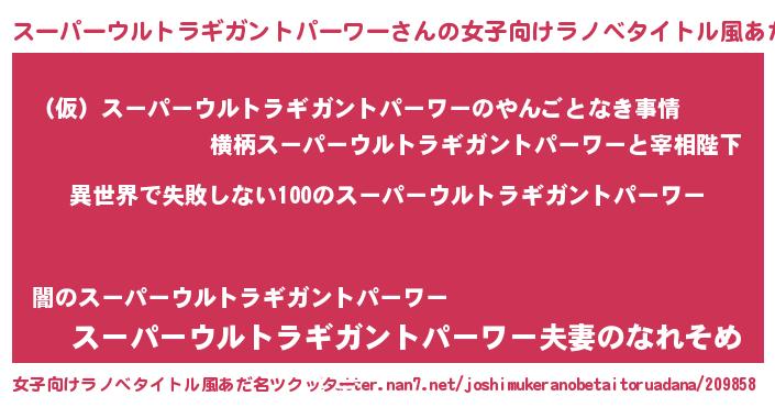 | 男性向けラノベタイトル風あだ名 | 『スーパーウルトラギガントパーワーという概念が存在しない退屈な世界 』 |