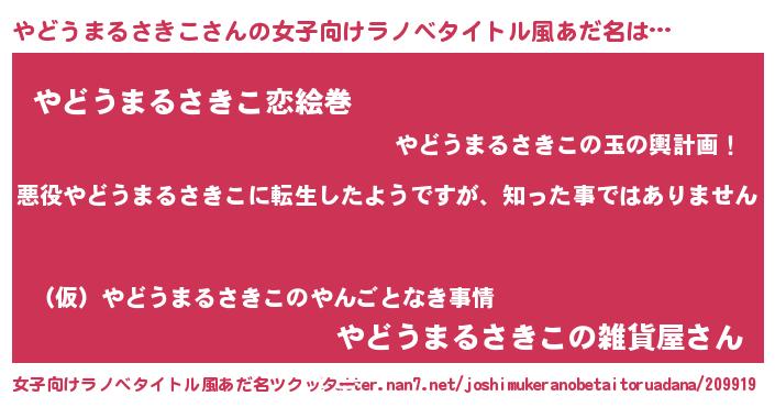 | 男性向けラノベタイトル風あだ名 | 『この素晴らしい世界にやどうまるさきこを!』 |