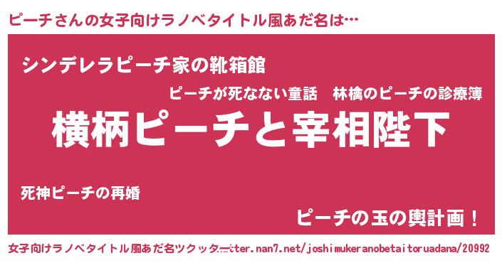 | 男性向けラノベタイトル風あだ名 | 『ピーチに滅ぼされるだけの簡単なお仕事です』 |