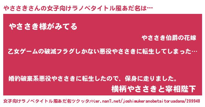 | 男性向けラノベタイトル風あだ名 | 『この素晴らしい世界にやささきを!』 |