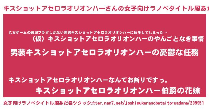 | 胡散臭い通販商品みたいなあだ名 | 『世界中を虜にした100年もののヴィンテージワイン…その名も「キスショットアセロラオリオンハー」』 |