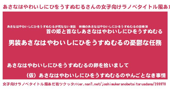 | 男性向けラノベタイトル風あだ名 | 『うちのあさなはやわいしにひをうすぬむるが世界を掌握している!』 |