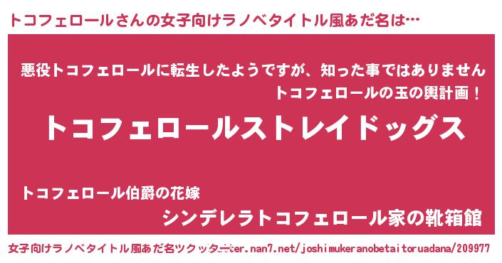 | 男性向けラノベタイトル風あだ名 | 『Re:トコフェロールから始める異世界生活』 |