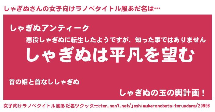 しゃぎぬさんの女子向けラノベタイトル風あだ名は… 『しゃぎぬは平凡を望む』『しゃぎぬアンティーク』『しゃぎぬの玉の輿計画!』 ツクッター #女子向けラノベタイトル風あだ名ツクッター http://tkutter.nan7.net/joshimukeranobetaitoruadana/20998/