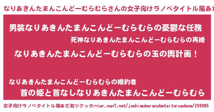| 男性向けラノベタイトル風あだ名 | 『なりあきんたまんこんどーむらむら~年齢イコール彼女いない歴の魔法使い~』 |