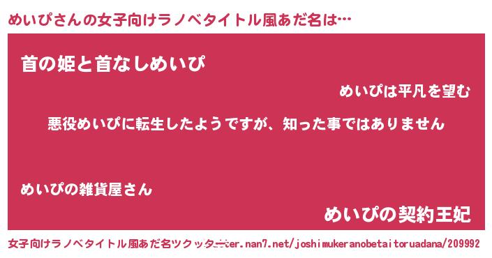 | 男性向けラノベタイトル風あだ名 | 『この素晴らしい世界にめいぴを!』 |