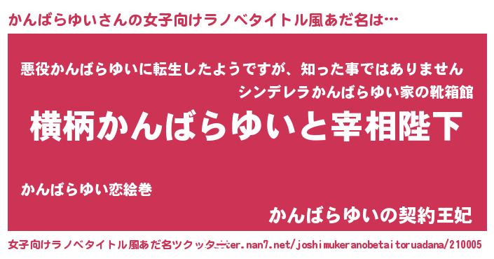 | 男性向けラノベタイトル風あだ名 | 『かんばらゆいに滅ぼされるだけの簡単なお仕事です』 |