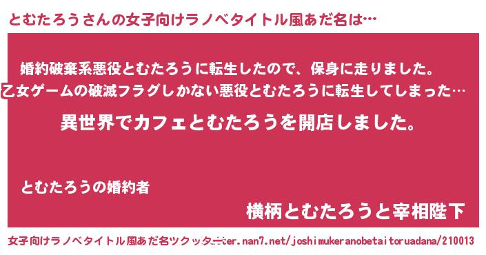 | 男性向けラノベタイトル風あだ名 | 『誰もが恐れるあのとむたろうが、ぼくの専属メイドになるようです。』 |