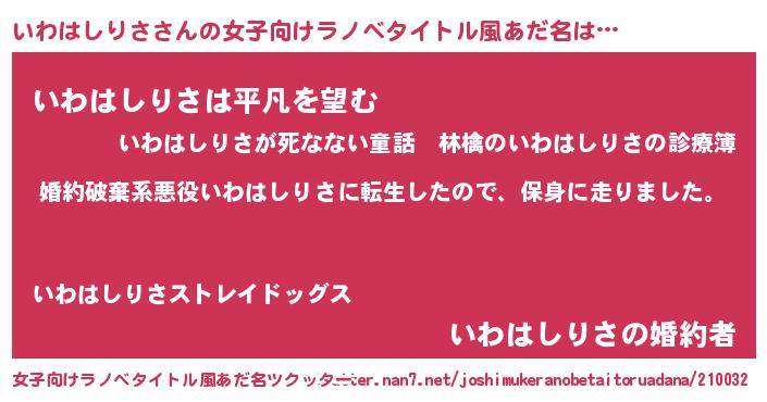 | 男性向けラノベタイトル風あだ名 | 『イワハシリサスレイヤー』 |