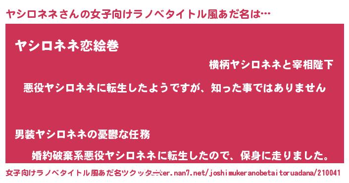 | 男性向けラノベタイトル風あだ名 | 『この素晴らしい世界にヤシロネネを!』 |