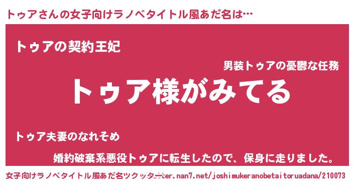 | 男性向けラノベタイトル風あだ名 | 『トゥアの嫁は女の子じゃないと思った?』 |