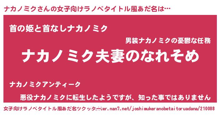 | 男性向けラノベタイトル風あだ名 | 『おまえをオタクにしてやるから、俺をナカノミクにしてくれ! 』 |