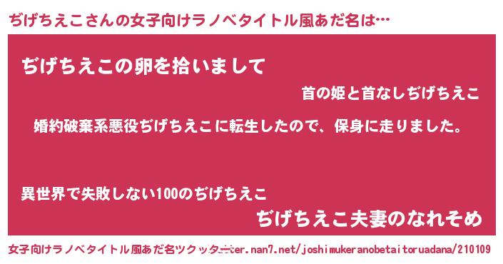 | 胡散臭い通販商品みたいなあだ名 | 『信頼と実績のネックレス…その名も「ぢげちえこ」』 |