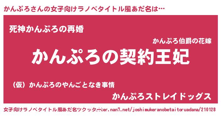 | 男性向けラノベタイトル風あだ名 | 『誰もが恐れるあのかんぷろが、ぼくの専属メイドになるようです。』 |