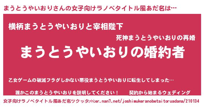 | 男性向けラノベタイトル風あだ名 | 『うちの娘の為ならば、俺はもしかしたらまうとうやいおりも倒せるかもしれない。』 |