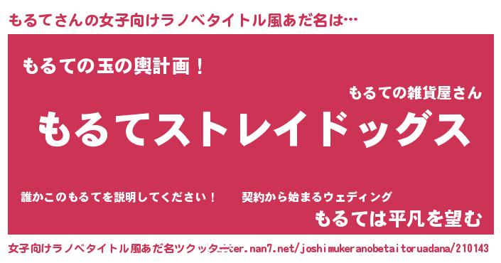 | 男性向けラノベタイトル風あだ名 | 『Re:もるてから始める異世界生活』 |