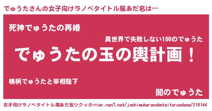 | 男性向けラノベタイトル風あだ名 | 『でゅうた~年齢イコール彼女いない歴の魔法使い~』 |