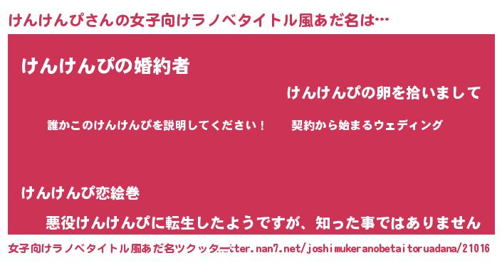 | 男性向けラノベタイトル風あだ名 | 『ケンケンピアートオンライン』 |