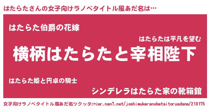 | 男性向けラノベタイトル風あだ名 | 『はたらたに滅ぼされるだけの簡単なお仕事です』 |