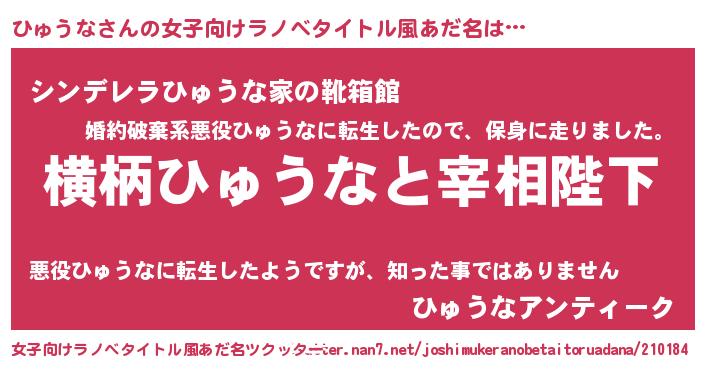 | 男性向けラノベタイトル風あだ名 | 『ひゅうなに滅ぼされるだけの簡単なお仕事です』 |