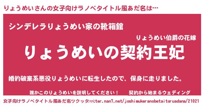 | 男性向けラノベタイトル風あだ名 | 『りょうめいという概念が存在しない退屈な世界 』 |