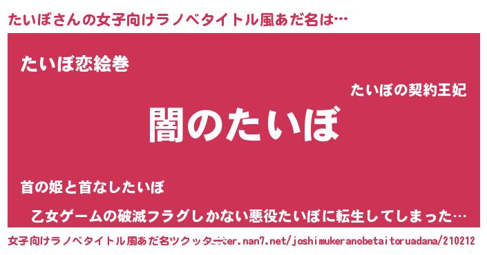 | 男性向けラノベタイトル風あだ名 | 『Re:たいぼから始める異世界生活』 |