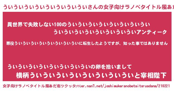 ういういういういういういういういさんの女子向けラノベタイトル風あだ名は… 『悪役ういういういういういういういういに転生したようですが、知った事ではありません』『異世界で失敗しない100のういういういういういういういうい』『横柄ういういういういういういういういと宰相陛下』 ツクッター #女子向けラノベタイトル風あだ名ツクッター http://tkutter.nan7.net/joshimukeranobetaitoruadana/210221/