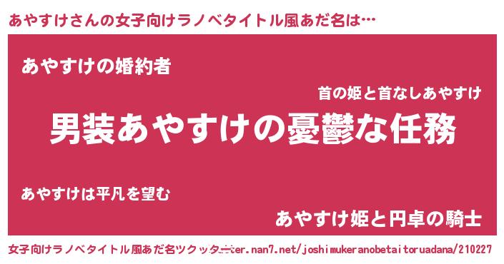 | 男性向けラノベタイトル風あだ名 | 『冴えないあやすけの育てかた』 |