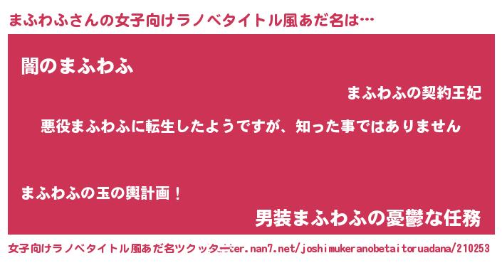 | 男性向けラノベタイトル風あだ名 | 『この素晴らしい世界にまふわふを!』 |